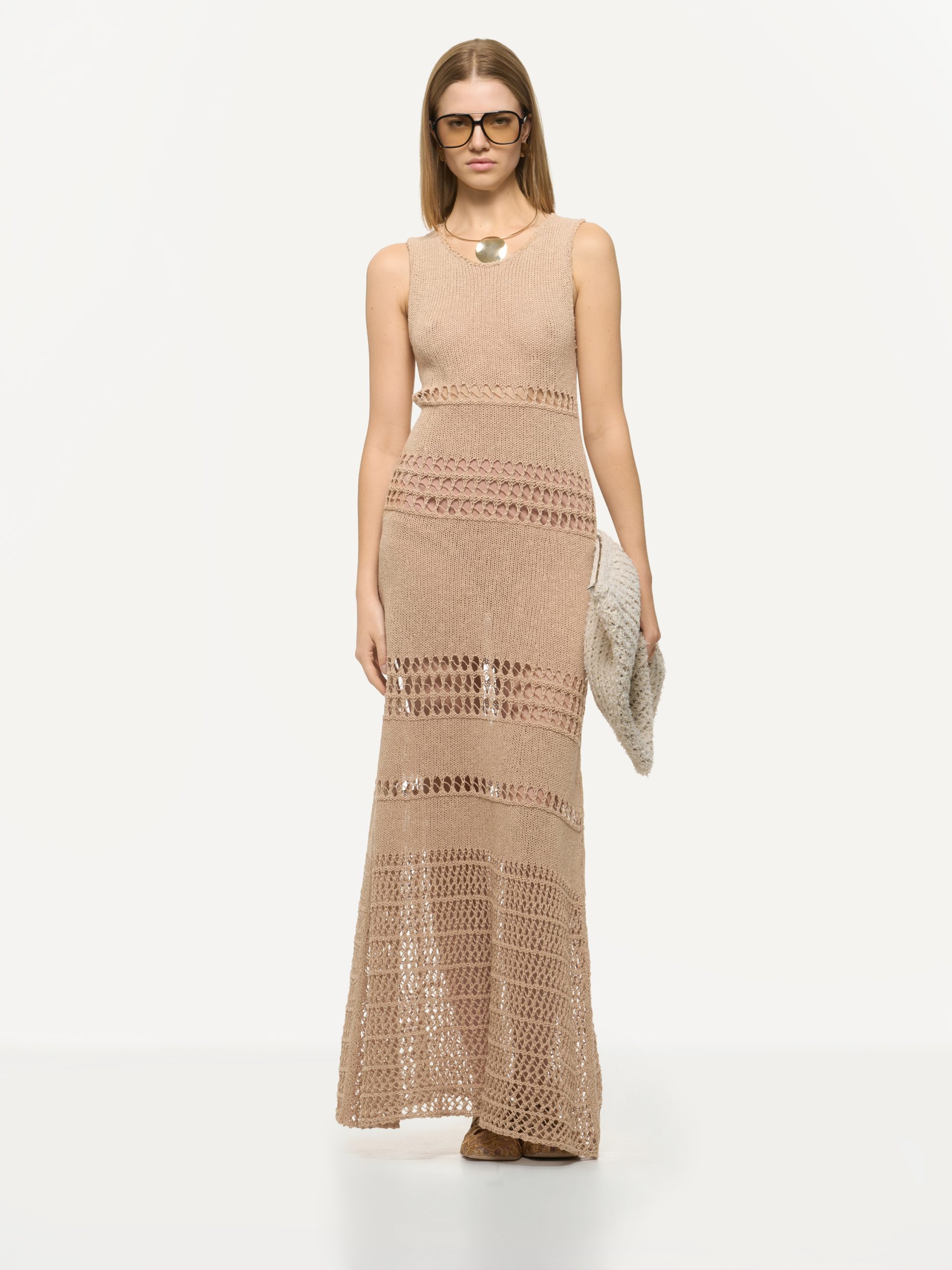 Abito lungo in misto cotone, lino e seta senza maniche, lavorato interamente a maglia con dettagli di maxi fori