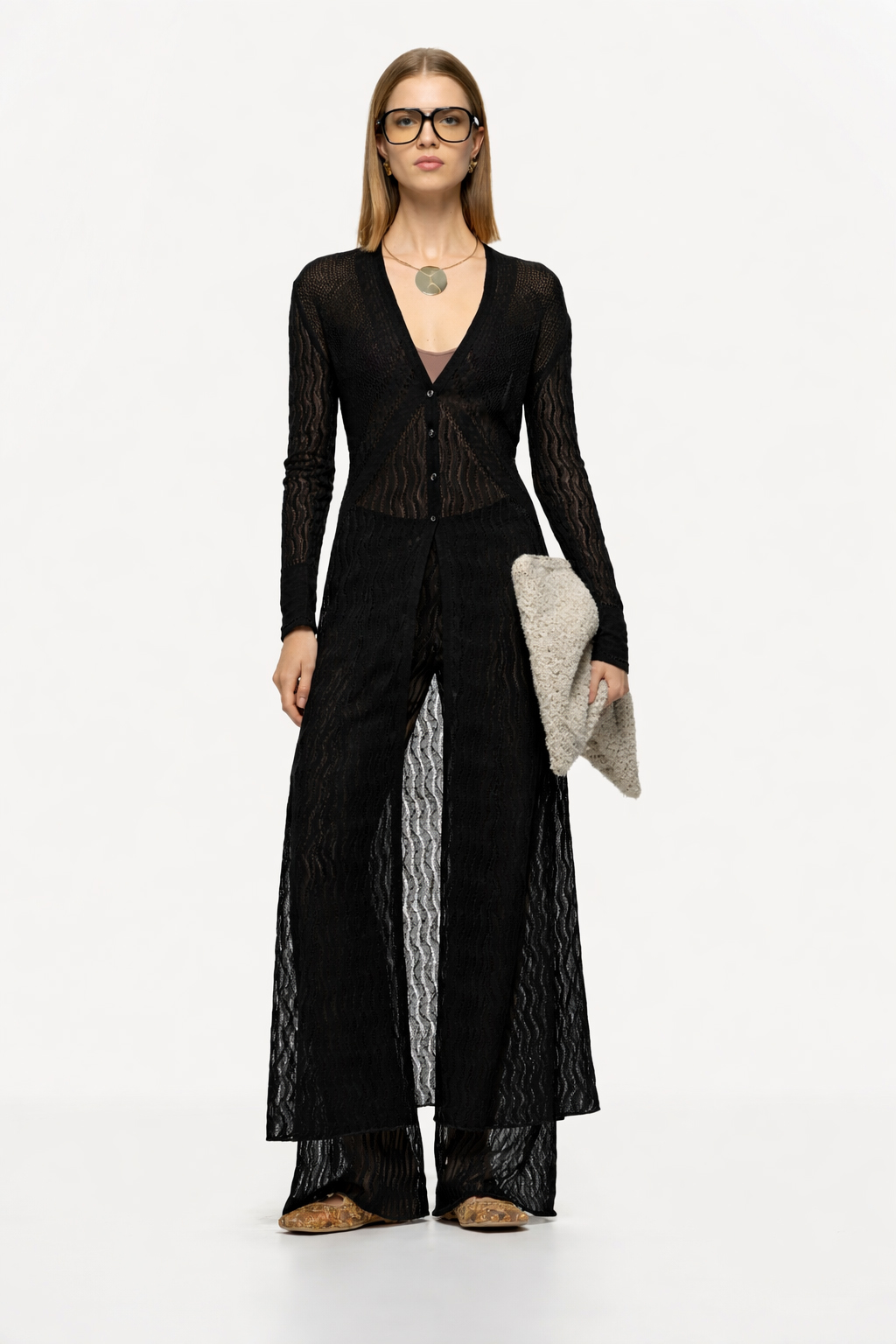 Chemisier lavorato interamente a maglia a punto punzonato, con qualche bottone frontale e dal design elegante e raffinato.
