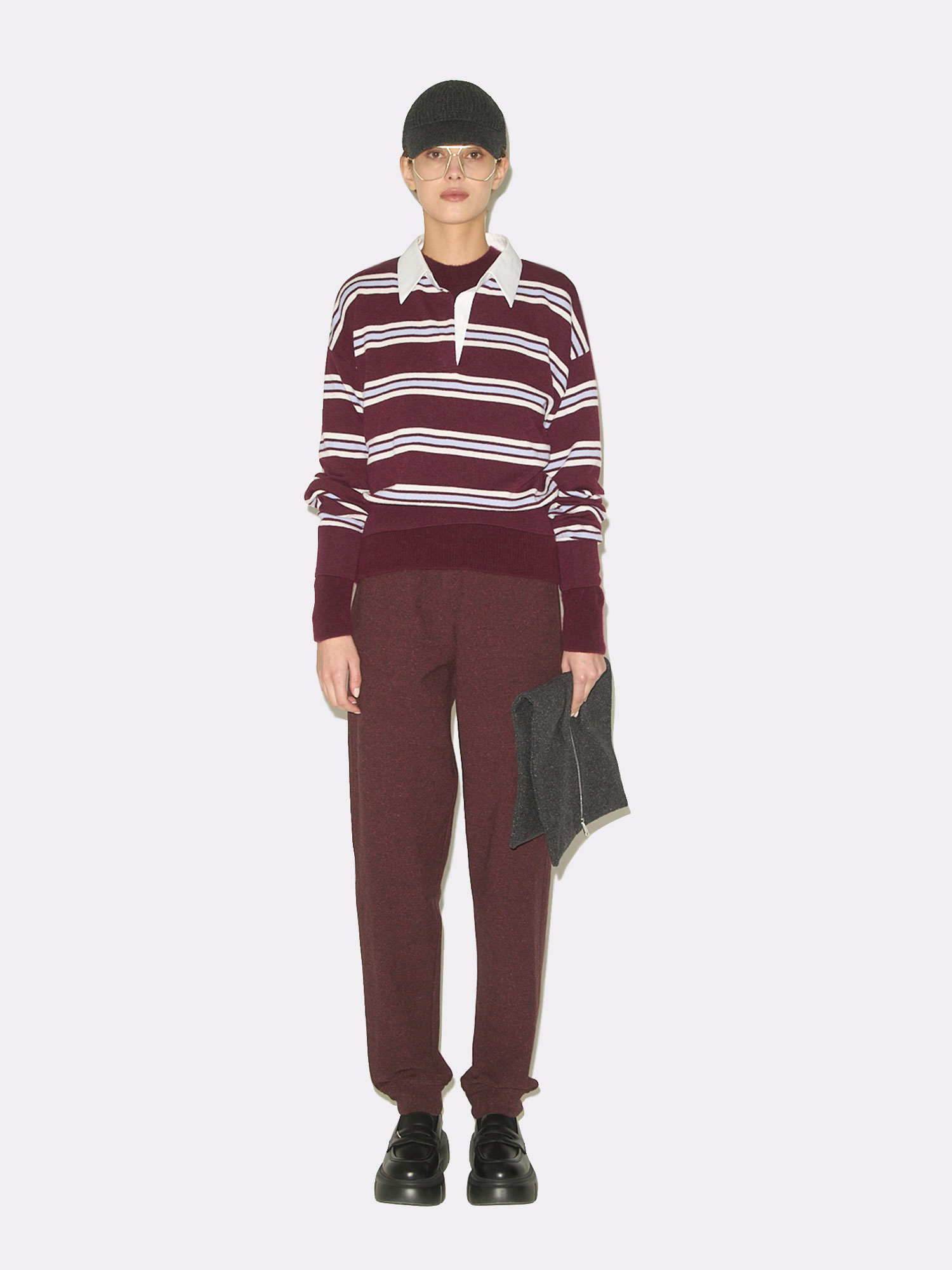 Polo a manica lunga, realizzata interamente in maglia con collo camicia senza bottoni. Righe orizzontali a 3 colori.