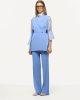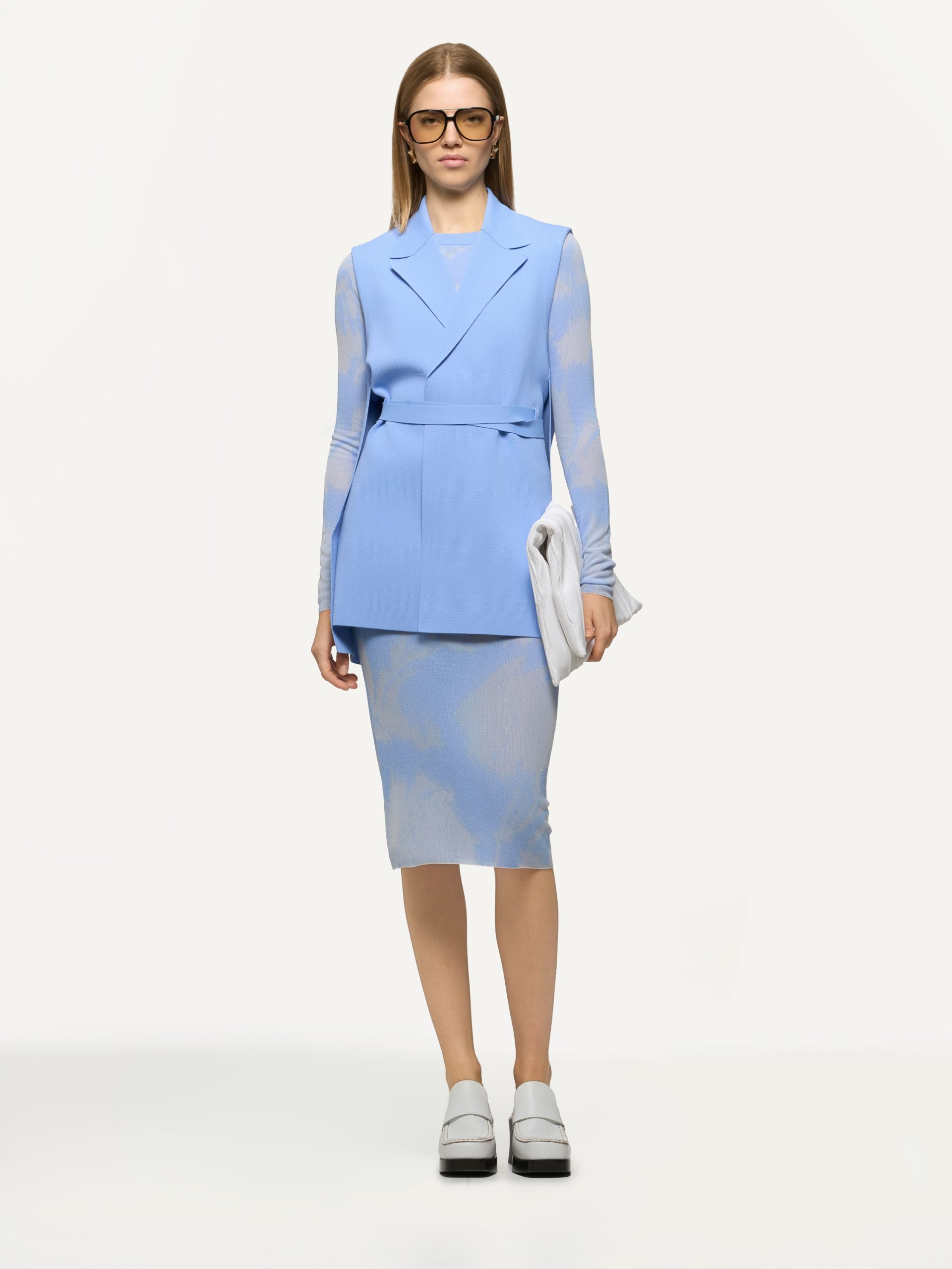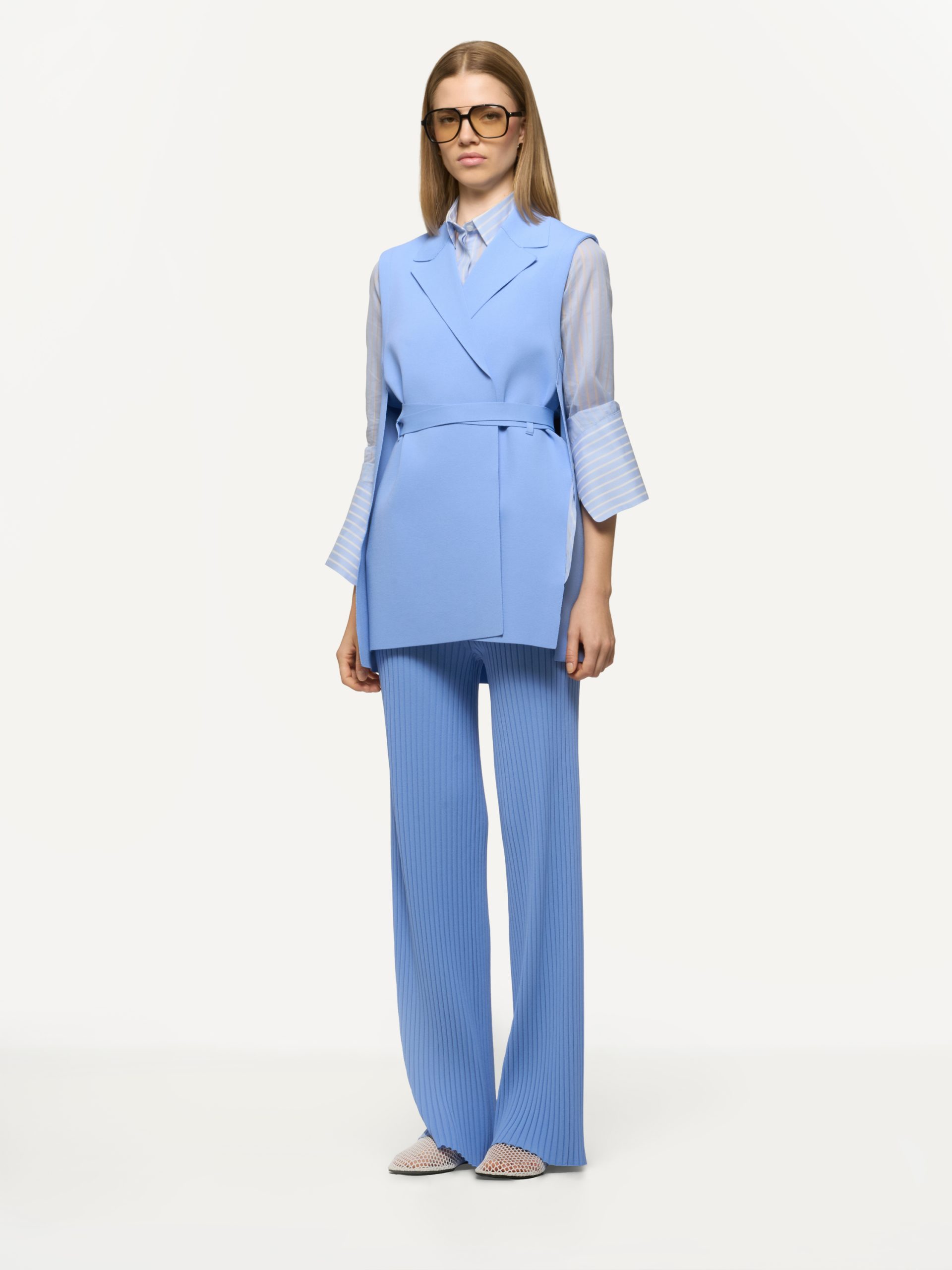 Smanicato in maglia di viscosa, senza bottoni, con spacchi laterali e cintura a fascia per un’allacciatura regolabile in vita.